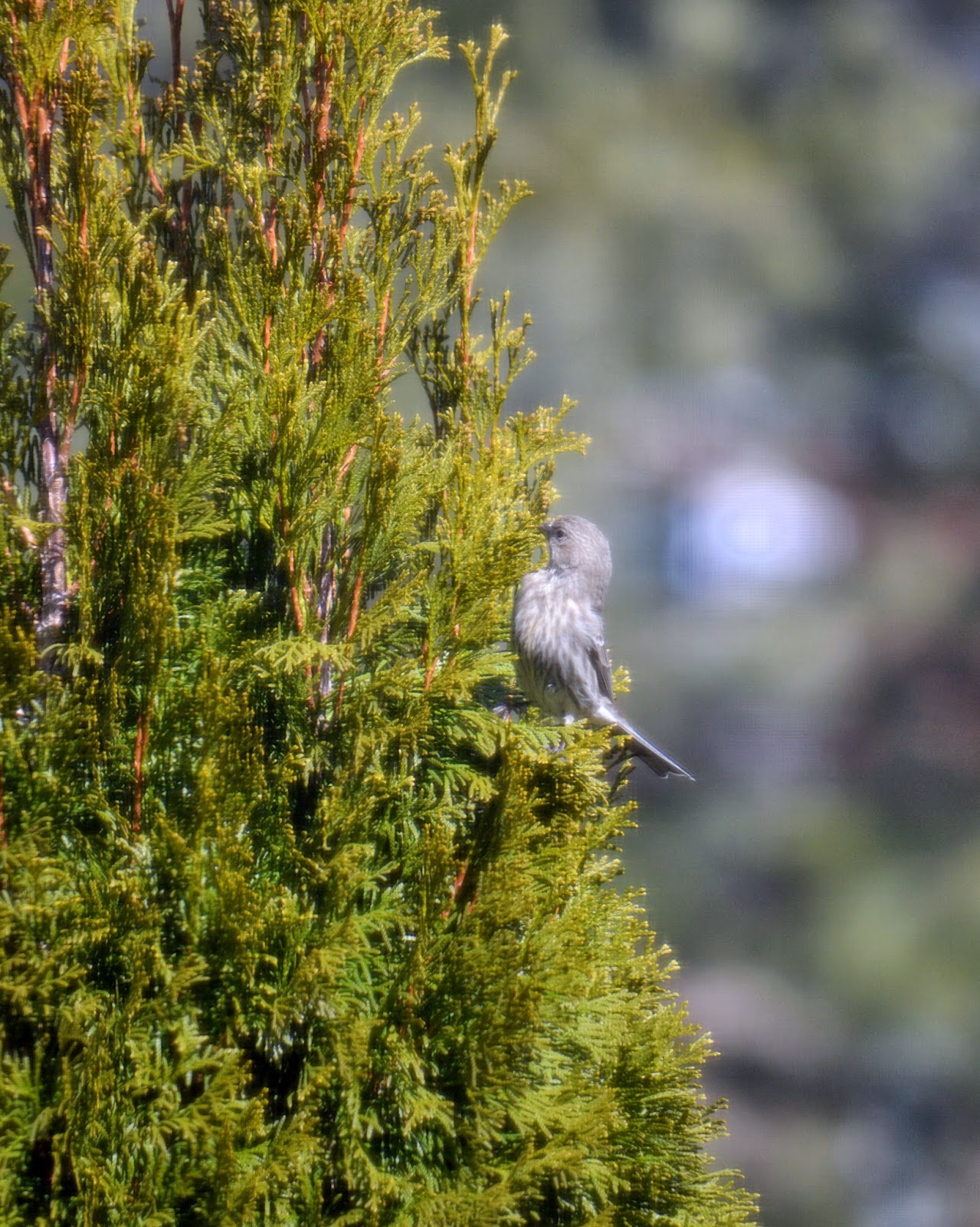 Mr. and Mrs. House Finch are setting up housekeeping in one of our Juniper Tree. Hubs planted them 3 years ago so they are not very big, but I guess the Finches are trying to keep up with the times. Little houses are the new thing, right?